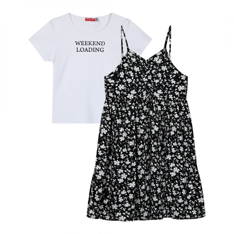 Αυτό το παιδικό φόρεμα μαζί με την κοντομάνικη μπλούζα του είναι μια γοητευτική επιλογή για κάθε κορίτσι. Με εντυπωσιακό χρωματισμό και σχέδιο φλοράλ προσθέτει κομψό ύφος σε κάθε εμφάνιση. Ελαφρύ και δροσερό, ιδανικό για καλοκαιρινές βόλτες.