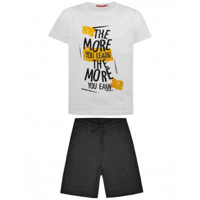 Η μπλούζα έχει τύπωμα και η η βερμούδα είναι μονόχρωμη, με πλαινές τσέπες, ελαστικό ζωναράκι και κορδόνι