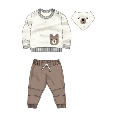 Απαλό, παιχνιδιάρικο και ιδανικό για τα πρώτα τους βήματα! Το σετ περιλαμβάνει μπλούζα με χαριτωμένο αρκουδάκι στην τσεπούλα, βαμβακερό παντελόνι με ελαστική μέση και σαλιάρα με σχέδιο μουτράκι.